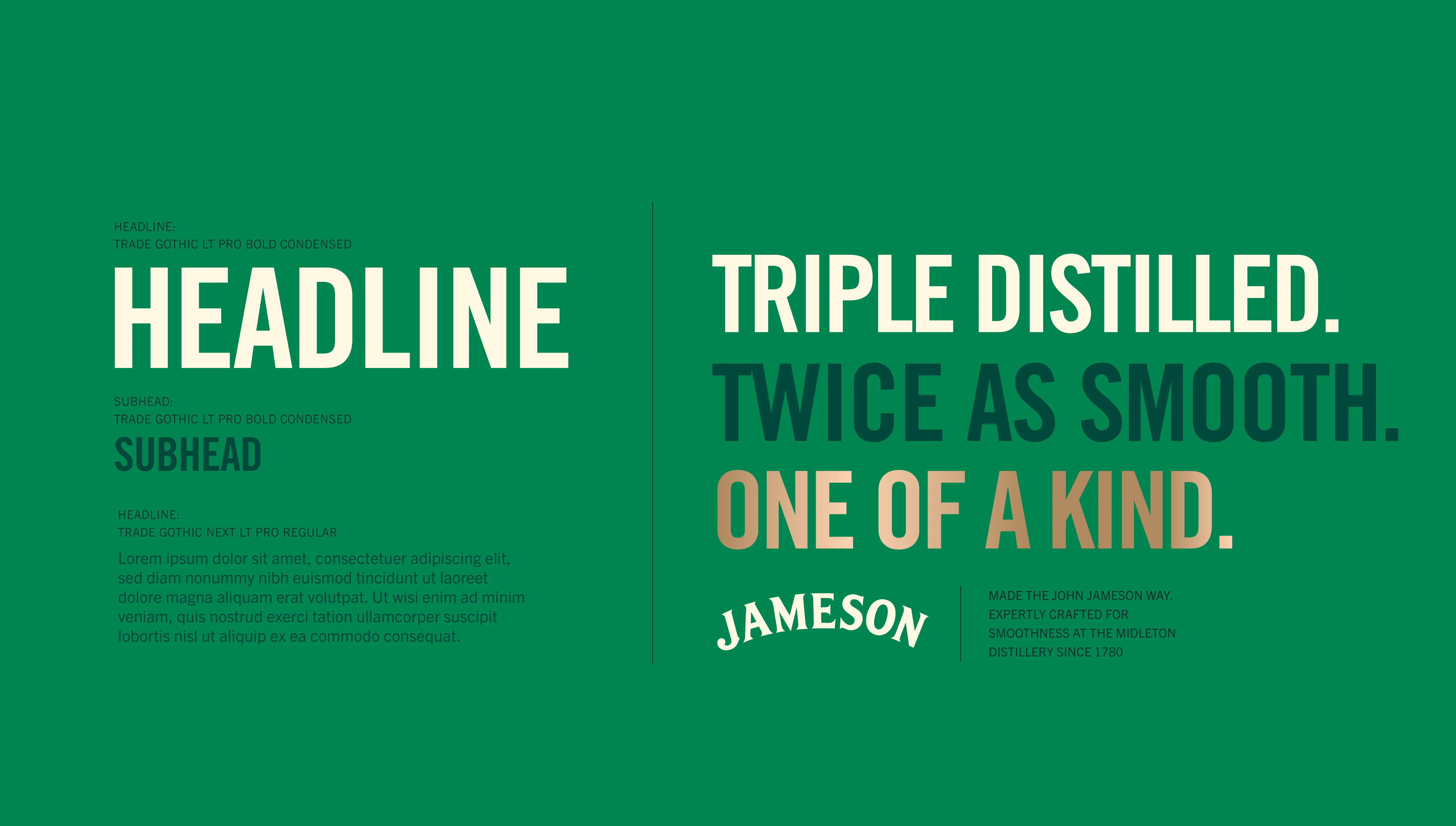 Looking at the rest of the off-pack brand elements such as icon and signifiers. Brightening up the color palette and introducing the neon elements to create a feeling of playfulness. The new layout system is cleaner, more modular, and built for flexibility across digital and physical formats. It’s designed to let the brand breathe—giving space for storytelling, while still feeling premium and intentional. Jameson has always had a wink in its eye, and we’re leaning into that with a tone that’s witty, self-aware, and unmistakably human.